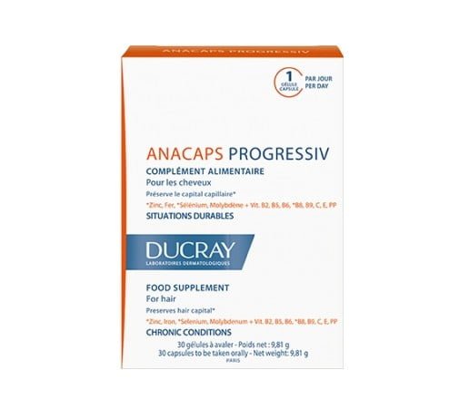 Anacaps Progressiv est un complément alimentaire spécialement adapté aux situations durables. Il préserve le capital capillaire et aide à conserver un cheveu en bonne santé sur la durée.