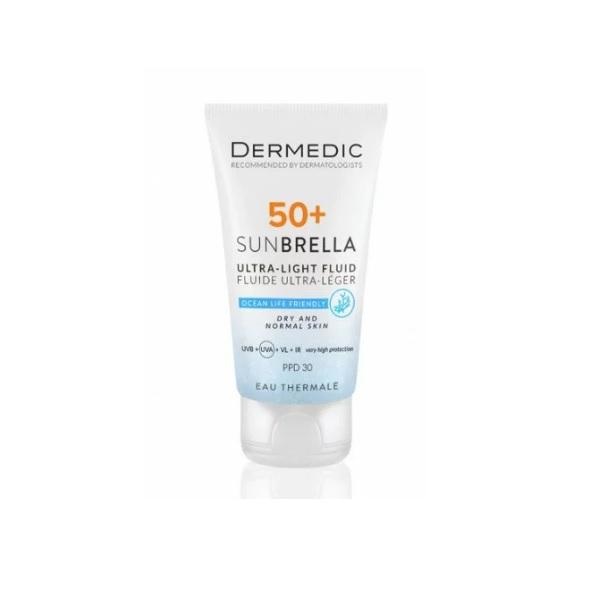 Le fluide ultra-léger SPF 50+ DERMEDIC SUNBRELLA associe une texture douce à base d’eau à un très haut niveau de protection des peaux sensibles sèches et normales contre tout le spectre des rayons du soleil. Intensément hydratant (eau thermale, glycérine), il pénètre rapidement et ne laisse pas de film blanc sur la peau.
