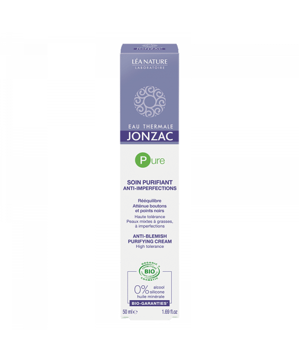 JONZAC PURE SOIN PURIFIANT ANTI-IMPERFECTIONS est une crème légère à base d’eau qui purifie la peau, élimine les imperfections et révèle un teint unifié et lumineux.