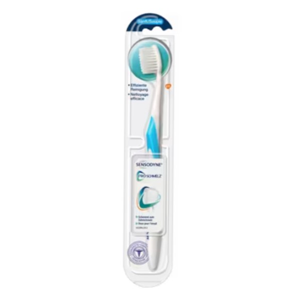 La brosse à dents Sensodyne Pro-Émail existe en deux souplesses : souple et extra-souple.