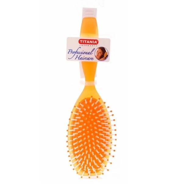- TITANIA Brosse Pneumatique est une brosse de massage mini, ovale avec un manche en plastique lisse, en plastique de haute qualité. Les billes en plastique aux extrémités de la brosse massent le cuir chevelu sans abîmer les cheveux. Le coussin en caoutchouc adoucit la pression sur le cuir chevelu, le protégeant des dommages. En raison de sa taille, la brosse est idéale pour un sac à main et sera toujours à portée de main